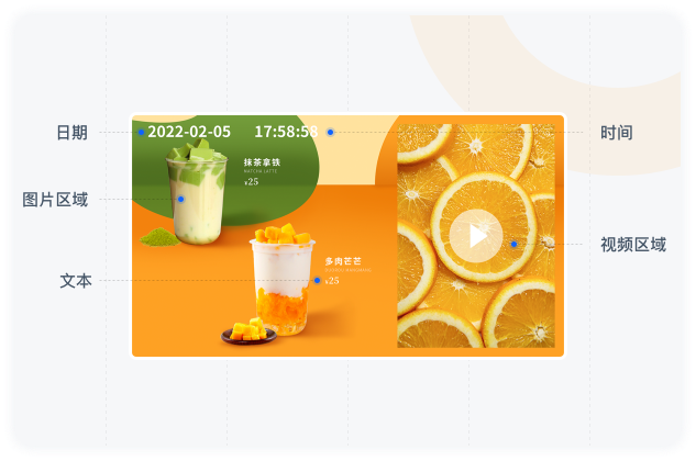 支持圖片、視頻、文本/跑馬、時間、日期等多媒體素材的發布。