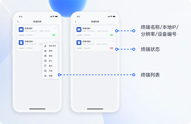 無需到達終端設備前,即可查看終端在線/離線/播放/停止等登錄狀態,省時省力;支持遠程控制終端播放/停止/重啟/休眠/喚醒/刪除/名稱修改等操作。