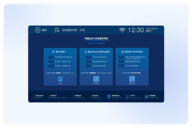 ezPoster是一款高效、便捷、安全、專業的局域網信息發布軟件;人人都可輕松實現節目可視化編輯、輕松制作吸睛節目、一鍵內容即刻上屏;自動尋機綁定,支持終端遠程指令發送,可廣泛應用在廣告傳媒、社區辦公樓、政府企業、餐飲娛樂、商超酒店、景區交通、文體場館、教育金融、醫療零售等場景。