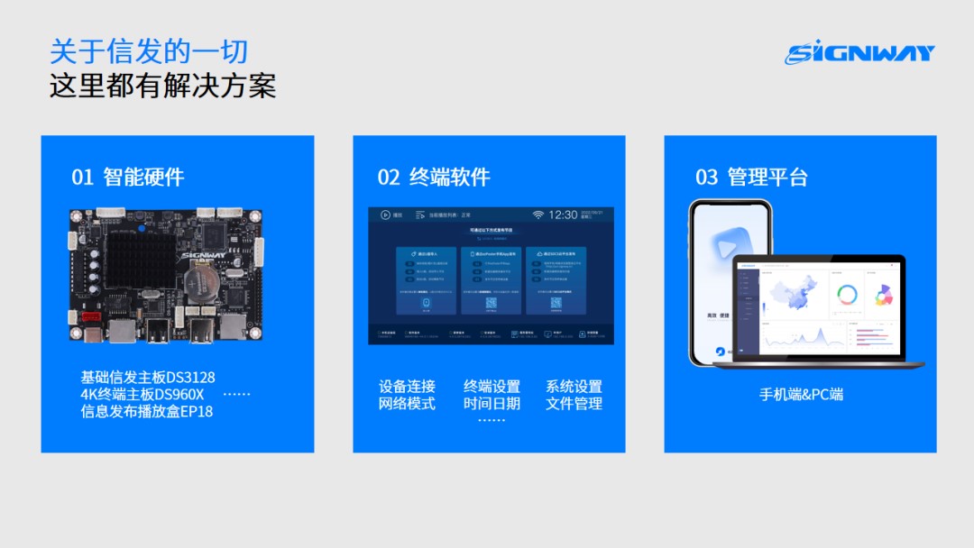 專(zhuān)注于商用顯示領(lǐng)域,欣威視通已深耕12年。圍繞商顯“信息發(fā)布”這一重要環(huán)節(jié),欣威視通打造了包含智能硬件、終端軟件以及管理平臺(tái)的信息發(fā)布一站式整體解決方案。