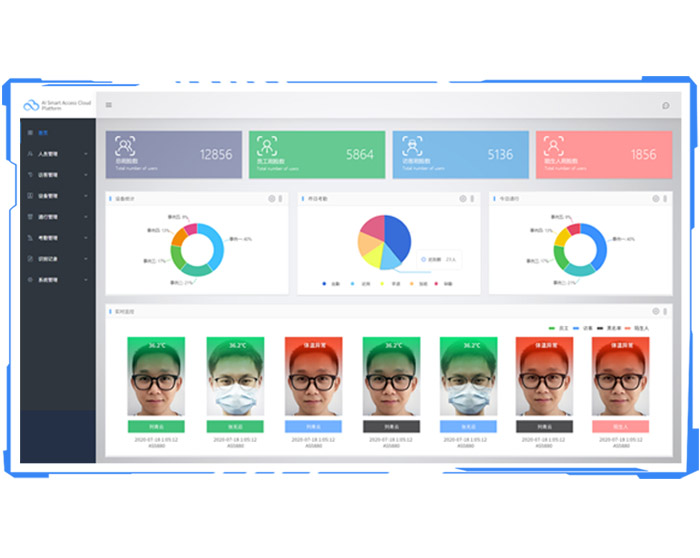 采用分布式部署,支持萬級數量不同系統的人臉識別測溫終端連接,集七大功能模塊為一體,操作簡單易上手, 實現人臉識別 / 體溫測量/考勤管理一站式平臺級管理服務,為用戶提供可快速集成的智慧通行軟硬件一體化 系統解決方案,同時采用blowfish+動態密鑰加密方式,安全可靠。